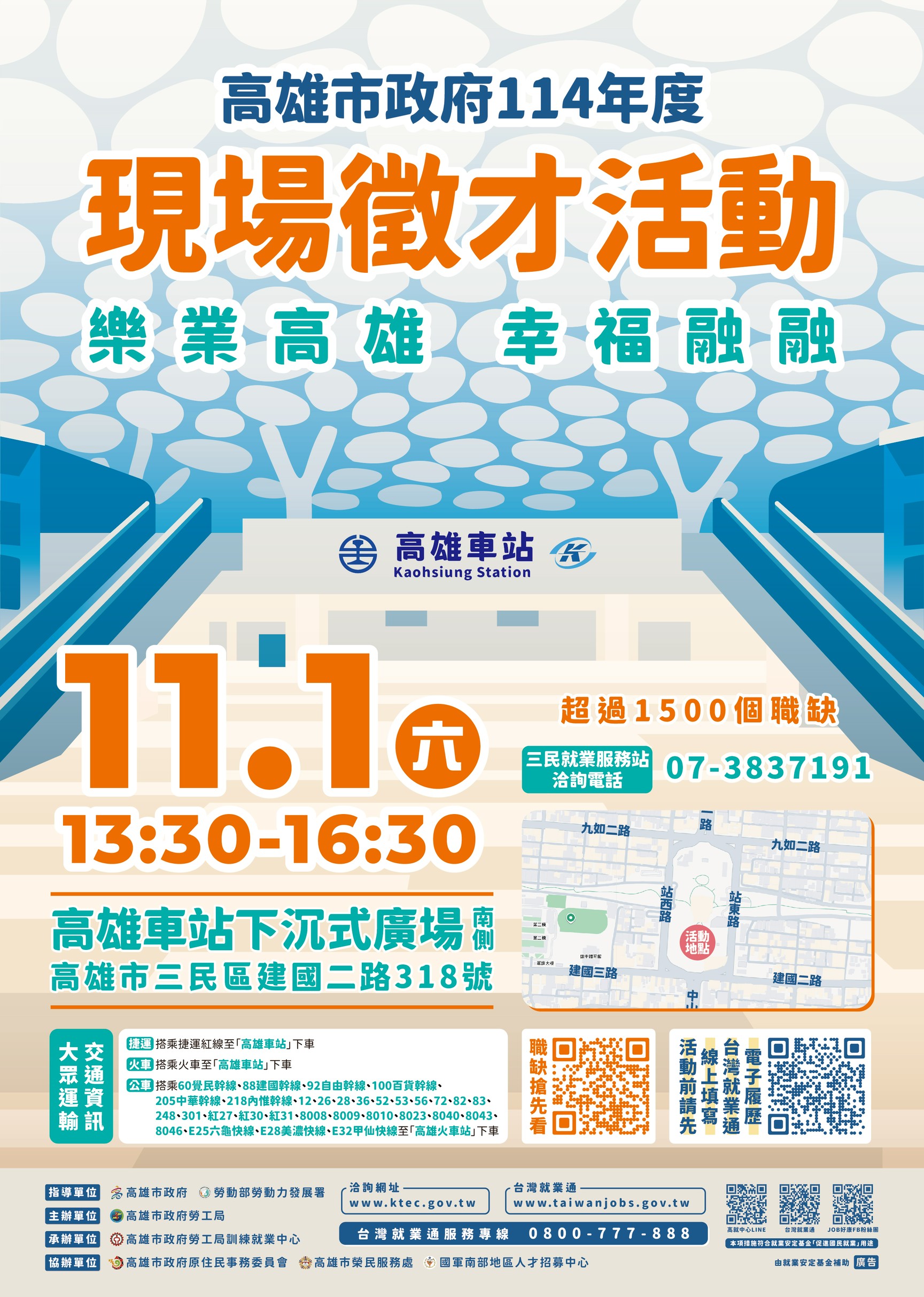 高雄市政府勞工局將於11月1日(六)下午13:30至16:30於高雄車站下沉式廣場南側(高雄市三民區建國二路318號)舉辦大型現場徵才活動,敬請把握機會!